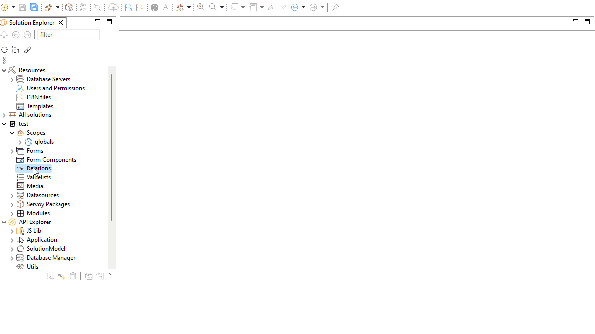 1. From the [Solution Explorer](https://docs.servoy.com/reference/servoy-developer/solution-explorer), right-click the "Relations" node and select "Create Relation". This will open the [Relation Editor](https://docs.servoy.com/reference/servoy-developer/object-editors/relation-editor).