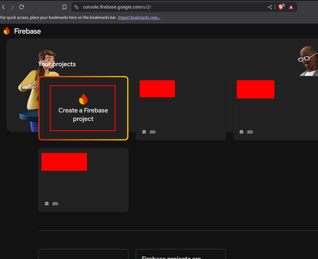 <figure><img src="https://3933488479-files.gitbook.io/~/files/v0/b/gitbook-x-prod.appspot.com/o/spaces%2FjpWd52BKwABWxF2lScUK%2Fuploads%2Fgit-blob-12b67f02a0948749f6ef75911da9ff99a6019ed7%2Fimage.png?alt=media" alt=""><figcaption><p>Create a Firebase project</p></figcaption></figure>