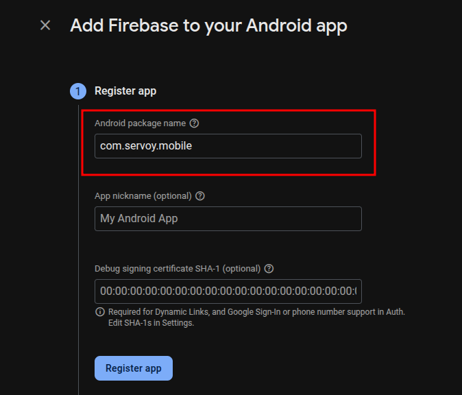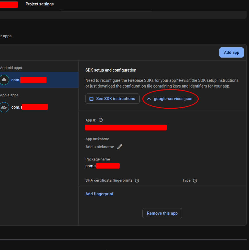 Once the Apps have been registered you can get the google-services.json and GoogleService-Info.plist files. This is used in our cloud builder and sets up your app to be able to receive messages.