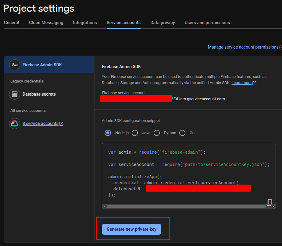 In order to send notifications we need to generate a private key for the service admin SDK. If you do not have a service account setup then you will need to create one first via "Manage service account permissions" link within the settings page.