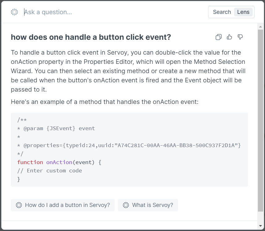 Did you know that Servoy's documentation site comes with AI-powered search? We've trained a large-language-model on our docs and it is ready to answer your question. You can try it out...right now! Just click `Ctrl-K` |`Cmd-K`.