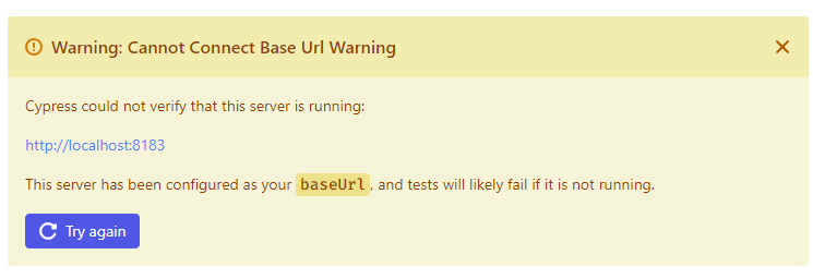Cypress may trigger a warning if the server is inaccessible. If you encounter this warning, please launch your Servoy Cloud application and try again.