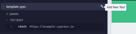 <figure><img src="https://3933488479-files.gitbook.io/~/files/v0/b/gitbook-x-prod.appspot.com/o/spaces%2FjpWd52BKwABWxF2lScUK%2Fuploads%2Fgit-blob-3720540fe32e4db0e9dffaa957633c9471350abd%2Fcy-add-test.png?alt=media" alt=""><figcaption><p>Add New Test in spec file</p></figcaption></figure>