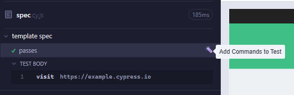 * Hover over the test name in the Spec details tab on the left and choose "Add commands to test."