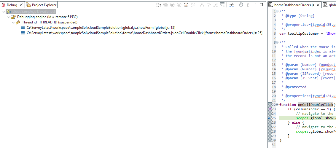 The Debug Panel shows the entire thread of code up to the highlight point. You can click on a line to switch to different JavaScript files. This helps keep track of your place if we are debugging in a deeply nested function.