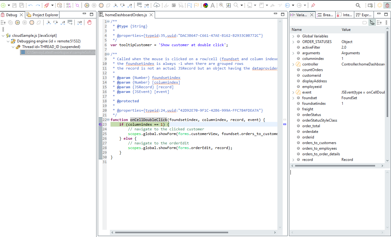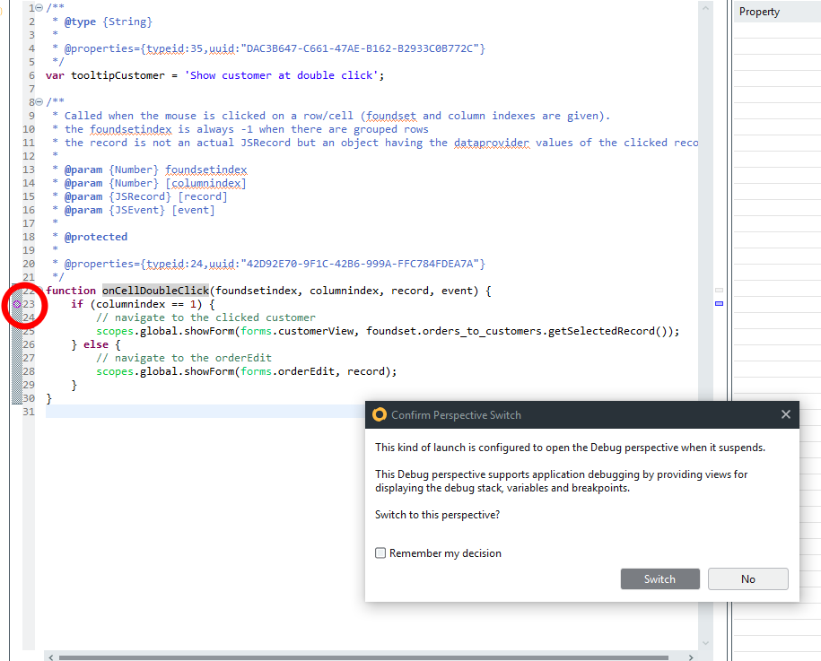 To jump into the Debug perspective we can start by setting up a breakpoint. By double clicking on the line number where we want the debugger to start inspection. Once we do that and the client reaches that point in the code, the "Perspective Switch" dialog should appear asking if we want to switch.