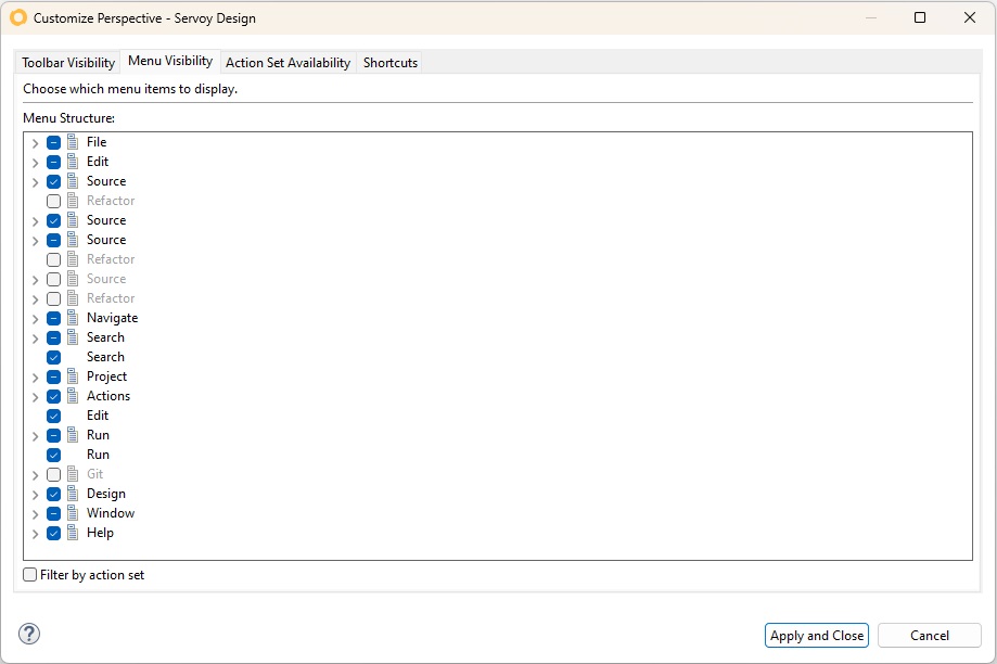 The **Menu Visibility** tab in the Customize Perspective configurator allows users to choose which menu items to display in the Servoy Design environment.\