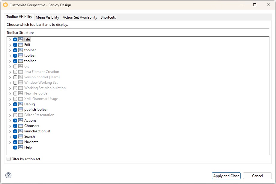 The **Toolbar Visibility** tab in the Customize Perspective configurator allows users to choose which toolbar items to display in the Servoy Design environment.\