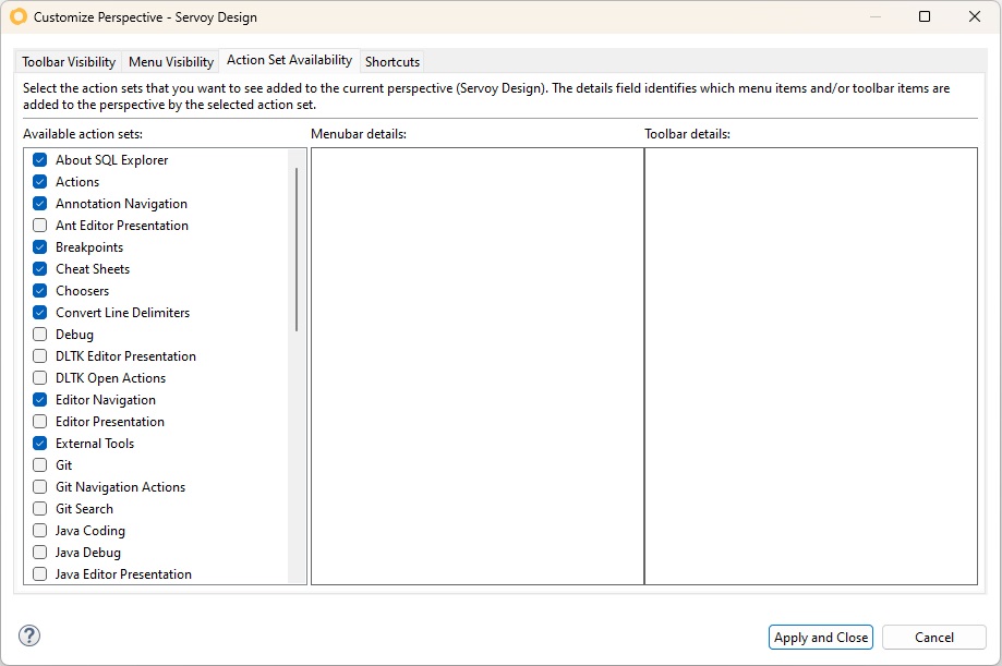 A list of action sets that can be added to the current perspective. Users can check or uncheck the boxes next to each action set to include or exclude them.