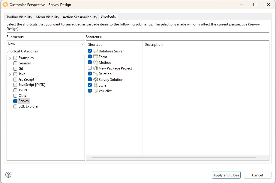 The **Shortcuts** tab in the Customize Perspective configurator allows users to select the shortcuts that you want to see added as cascade items to the following submenus. The selections made will only affect the current perspective.\