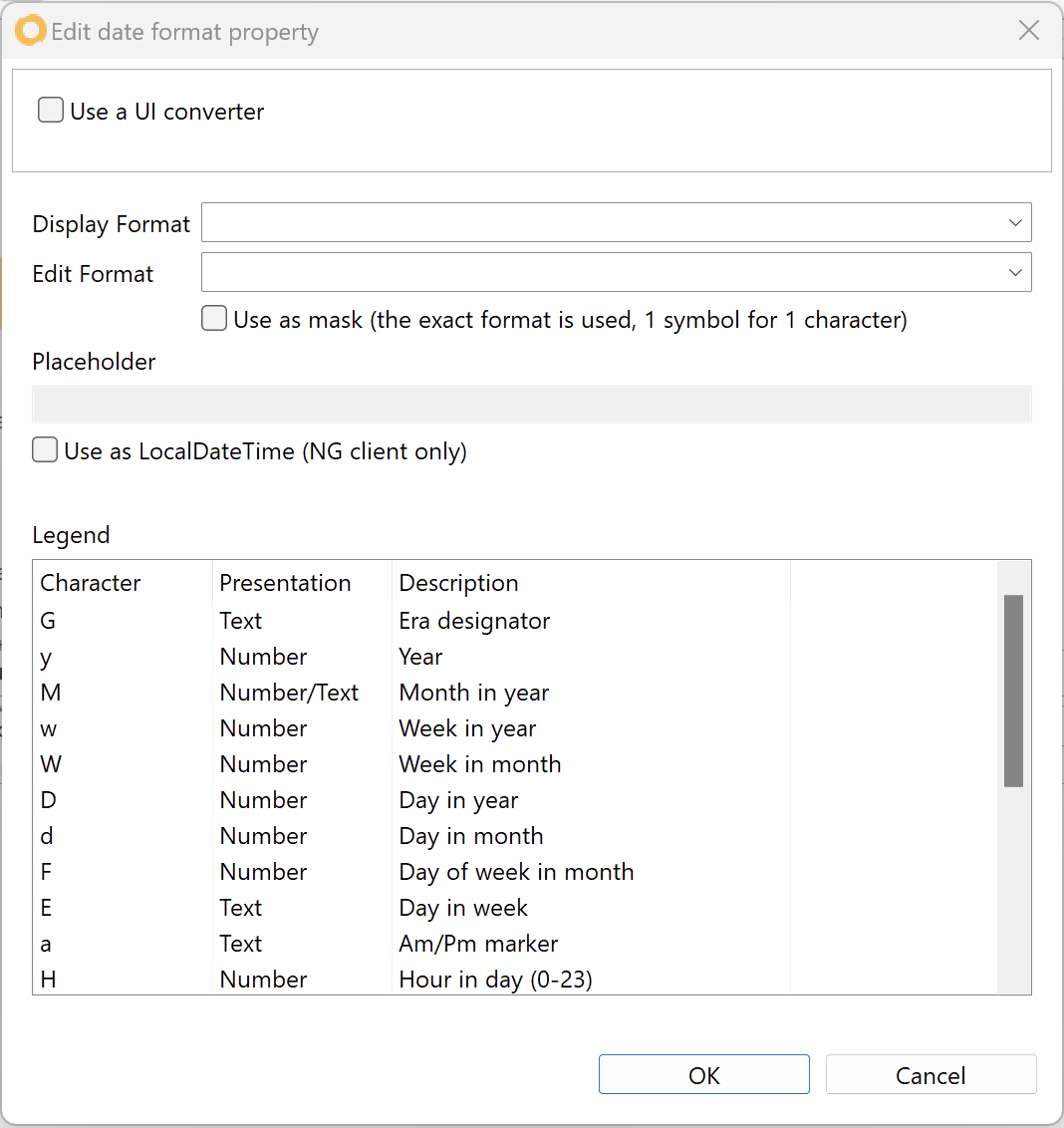 This is a helper list with all the special characters that can be used to define the pattern in the *Display Format* and *Edit Format*