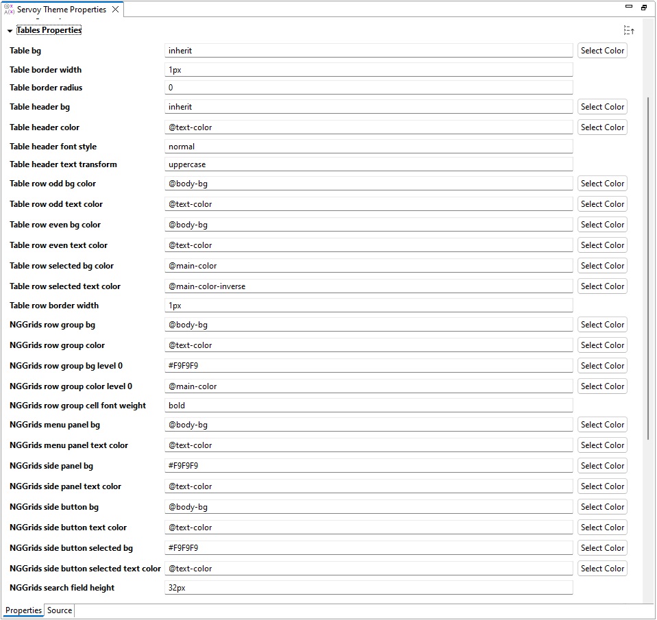 The **Tables Properties** section defines the styling of table and NG Grids components within the application. Tables are often used to display structured data, and these properties ensure that they are both functional and aesthetically pleasing.