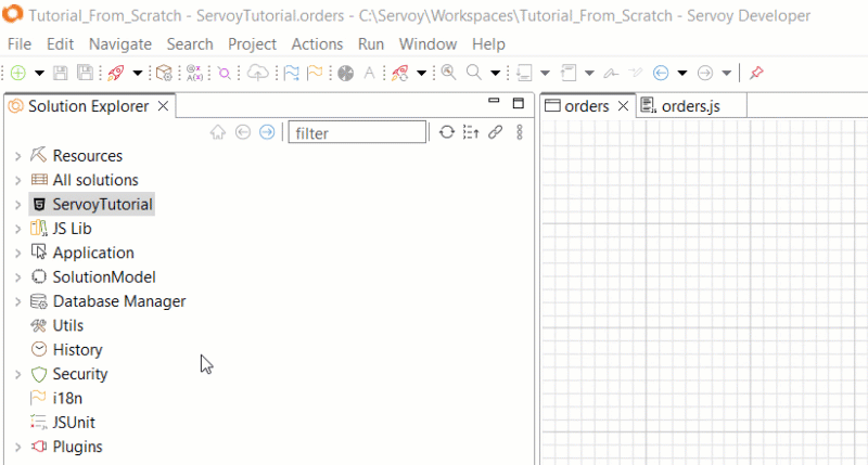 The **Solution Explorer** (sometimes called the SolEx) shows the entire contents of a solution in a tree-view. Each node in the Solution Explorer represents an object (or group of objects) in one's application, such as Forms, Relations, Scripting Scopes, etc. The Solution Explorer also shows a visual API reference for everything the [Servoy Core Developer API](https://docs.servoy.com/reference/servoycore/dev-api) and Plugins.