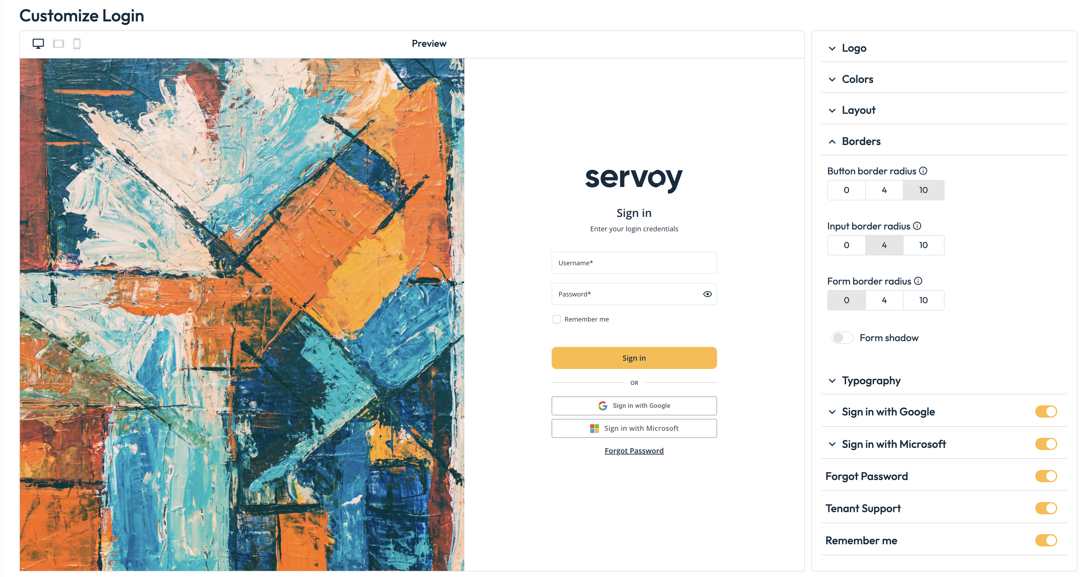 Starting from **Servoy 2024.12**, in combination with **Servoy Cloud** authentication, we now support more advanced options. We have added many design options for the login page, such as: