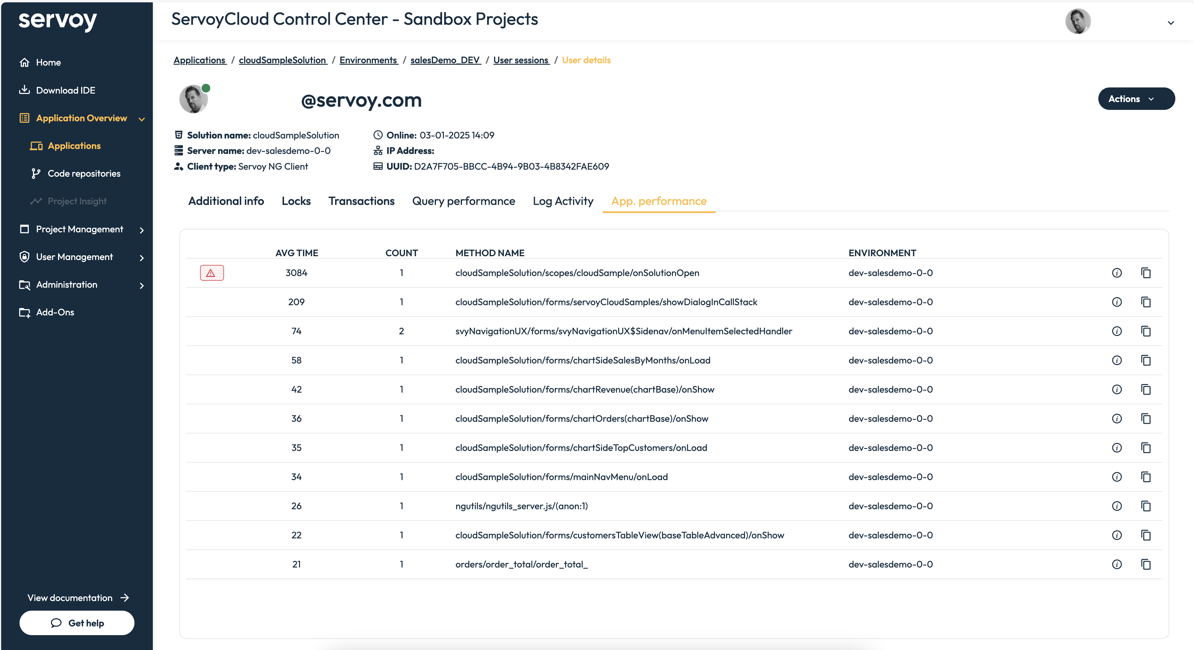 When navigating to the Active User Detail page, users can easily filter and view linked information, including log lines, query performance, and method performance.