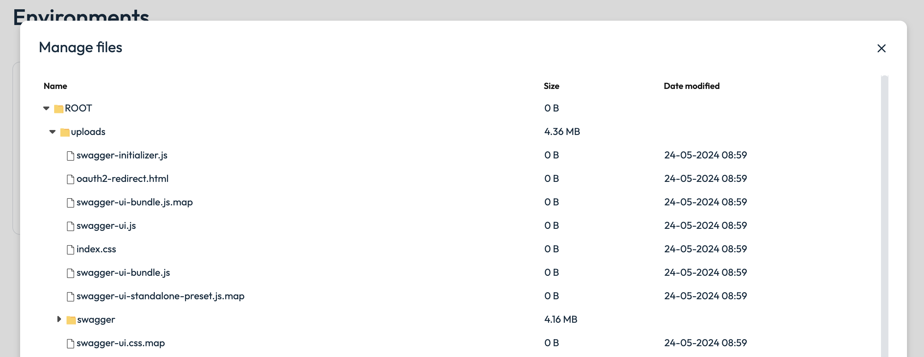 Application Overview -> Application -> Environments -> 3 Dots menu of an environment -> Manage Files\\